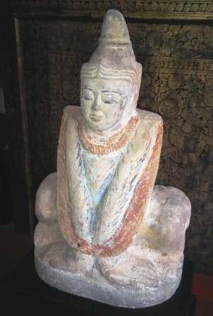 Diety in Sandstone Half Lion from Mon region, Natural Pigments Product ID: 163802 Origin: BurmaPeriod: 15thDimensions: Height: 49cm