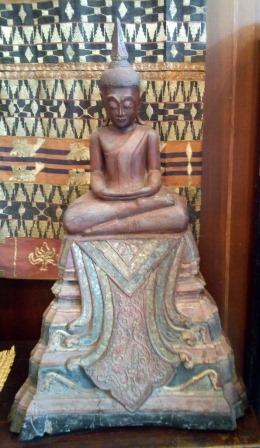 Seated Buddha with Throne in Teak Wood, Lacquer Gilt and Glass Inlay Product ID: 174336 Origin: BurmaPeriod: 18thDimensions: Height: 89cm