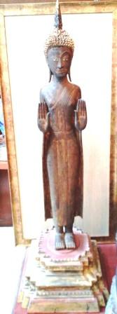 Standing Buddha in Teak Wood on Throne, Lacquer and Traces of Gold Gilt Product ID: 180839 Origin: LaosPeriod: 18thDimensions: Height: 120cm