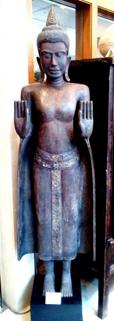 Tall Standing Buddha in Teak Wood with Lacquer and Traces of Gold Gilt Product ID: 11660999 Origin: CambodiaPeriod: 18thDimensions: Height: 178cm